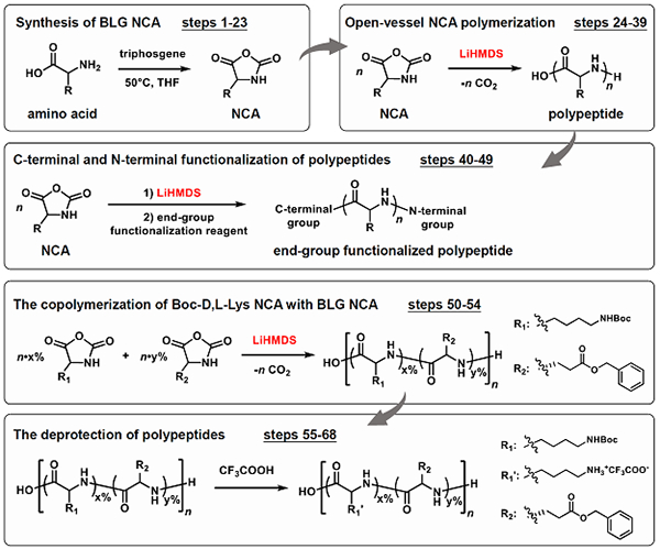 近日,華東理工大學劉潤輝教授課題組在建立NCA耐水快速開環聚合制備多肽聚合物的標準化方法方面取得進展。研究成果以“N-羧基環內酸酐(NCA)敞口聚合制備多肽聚合物(Open-vessel polymerizationof N-carboxyanhydride(NCA) for polypeptide synthesis)”為題,于2024年10月8日發表在《自然·協議》(Nature Protocols)上。圖片說明:NCA敞口快速開環聚合制備多肽聚合物的方法多肽聚合物因其在蛋白質/多肽模擬、抗菌、藥物與基因遞送以及組織工程等領域的廣泛應用而備受關注。自1906年Hermann Leuchs首次報道N-羧基環內酸酐(NCA)以來,NCA開環聚合成為合成多肽聚合物的經典方法。然而,傳統NCA聚合通常對水分敏感、聚合速率較慢且難以制備高分子量的多肽聚合物,這些長期遺留的合成挑戰制約了多肽聚合物的應用和發展。針對上述問題,劉潤輝教授課題組以雙三甲基硅基胺基鋰(LiHMDS)為引發劑實現水分耐受、快速NCA開環聚合,并建立了標準化的NCA耐水快速開環聚合的方法。本論文系統地描述了NCA耐水快速